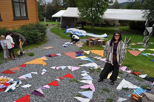 På bildet over lager Tove Kvernvik - en av de brennende sjelene - vimpler som skal pryde trær i hagen. Trærne får hjerter også, og de blir lyssatt i mystisk blått. Thams´ vesle park omdannes til en eventyrhage lørdag. Hagen danner rammen for et program som omfatter kunstutstilling, konserter, matkunst, sirkusskole, spøkelsesshow, det lille korslaget, en STOR (6 meter høy) sprellemann i isopor og mye, mye mer. - Vi lager et fyverkeri av en dag og kveld. Alt skjer på lørdag. Take it or leave it! sier Tove Kvernvik.